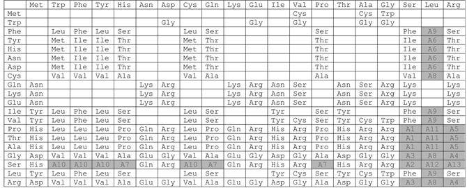 We introduce one concise representation for 307 elements of the principal set-U3. In Figure 6, for each Ama of this set (it is indicated in the corresponding cell), the amino acid Ama1 is plotted along the abscissa axis, and the ordinate is Ama2 (see Figure 3(a)). It turned out that the resulting representation is not homogeneous, but contains multiple ambiguities: these are cases when more than one Ama value corresponds to the same Ama1 and Ama2 values. It turned out that the number of ambiguities in the range from 2 to 4. All these cases are shaded in Figure 6 and they are denoted by A1-A13, and their decoding is given in the caption to this figure.