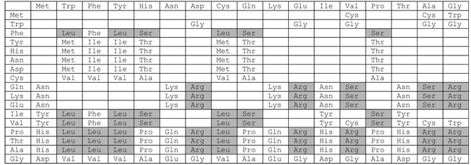 Ser: bca, bcc, adY; Leu: cbX, cbb, bbX; Arg: cdN, adX. (23)