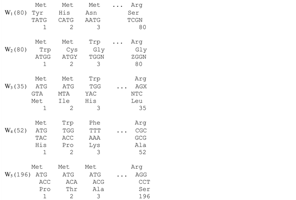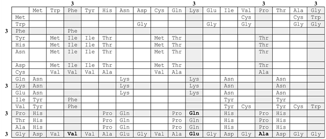 where n.s. is the nucleotide sequence. From (12) we have single-valued encodings for 4 amino acids: Gln, Glu, Val, Ala, and with (9) we find: