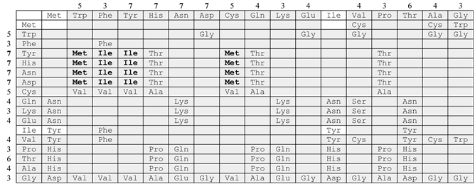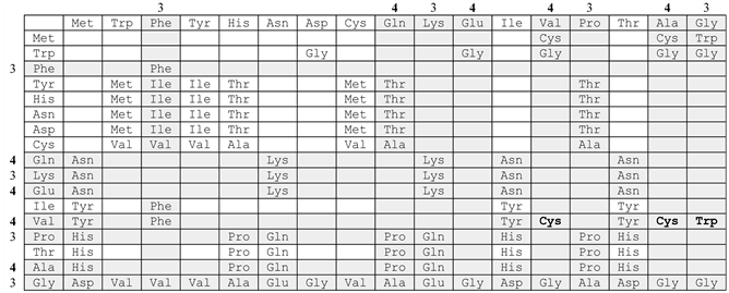 From Table 1 it follows that the value of m12 does not exceed the number 4 for the amino acids from (5) with the numbers from 1 to 17. The number 4 means that the first and second positions can be single-valued, which can not be said for m12 for Ser, Leu, Arg, for which these values are 7.8.7, respectively. Therefore, in the next ste.o.s 3-7 only amino acids from (5) with numbers up to 17 will be considered. Note that the calculation of the encodings for all amino acids from (5) is carried out according to the method published in [3]