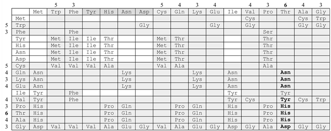 Step 6. In Figure 8 (step. 6), after inserting the bands 6 corresponding to Thr along the vertical and horizontal lines, four amino acids were identified in bold: 3 times Asn, once Tyr, 3 times His and once Asp. These amino acids correspond to the overlap: