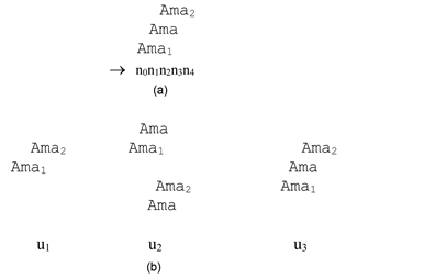 Figure 3. (a) For amino acid Ama, encoded by the triplet n1n2n3, there are 2 alternative amino acids Ama1 and Ama2. Their encodings are formed by −1, +1 shifts in the same DNA (®) chain. The codon n0n1n2 for Ama1 overlaps with codon n1n2n3 for Ama-the overlap contains two nucleotides n1n2; The codon n2n3n4 for Ama2 overlaps with codon n1n2n3 for Ama-the overlap contains two nucleotides n2n3. As a result, the triple overlap contains only one common position n2. (b) Elements of sets of combinations of amino acids, formed on the basis of elementary overlap from Figure 3(a). On the left there is one element of the set U1, in the center there are two elements of the set U2 and to the right one element of the set U3.