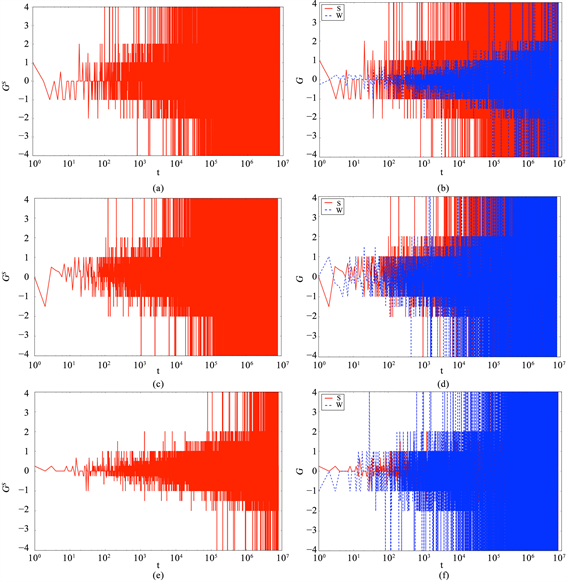 Figure 1. Agents gain over time in regular lattices. (a) Strong agents, with ρS = 0.1; (b) Both Strong (red) and Weak (blue) agents, with ρS = 0.1; (c) Strong agents, with ρS = 0.5; (d) Both Strong (red) and Weak (blue) agents, with ρS = 0.5; (e) Strong agents, with ρS = 0.9; (f) Both Strong (red) and Weak (blue) agents, with ρS = 0.9. Each plot refers to single and randomly selected realizations.