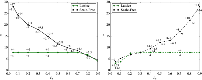 The motivation is related to the opportunity to exploit the high number of non-expert agents when ρS is small. Instead, for the W agents, as in the regular lattice we observe that their actual risks increase while increasing ρS. At this point, the previous results show fluctuating gains and, in principle, one might compare them to the fluctuating prices of financial assets. Therefore, we need a macroscopic measure to obtain further information on the population. As previously mentioned, the volatility allows observing the system considering the average behavior of the population, in different realizations (i.e. according to a Monte Carlo approach). Figure 3 reports a comparison between considering S (and W) agents in the two structures. A fast glance to both plots allows appreciating the Strong difference, in the proposed model, between a regular structure and a heterogeneous one. In particular, on the left of Figure 3 we observe the two vitalities referred to scale-free (black line) and regular lattice (green line). In addition, for each point in the plot, it is reported the highest and the smallest value computed (on average). The same, considering W agents, in reported in the right plot of Figure 3. Looking at the range of gain used to compute the volatility, one might observe the high risks of W agents in scale-free networks when populated by too many expert users. At the same time, S agents achieve on average 0 good positive gain only if their density is smaller than ρS = 0.4, because