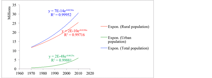The time series trend line of total population (R2 = 0.9995), rural population (R2 = 0.9972) and urban population (R2 = 0.9988) computed from least squares trend line plotting method show that these trend lines explains approximately 99.9% of reality. The real annual rate of growth of urban population is 6.3%. The trend line equation in the graph indicates that the residency pattern in terms of urban population was increased by more than six per cent per year (Figure 4). The trend lines clearly indicate that the period before and after 1990 has distinctly two different patterns. The increase in urban population was slower before 1990 and became faster after 1990, but the growth of total population (2.36%) and rural population (1.96%) are uniform throughout the 40 years period.
