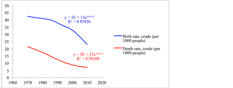 The time series trend line of death rates, crude (per 1000 people) computed from least squares trend line plotting method shows that the trend line explains approximately 99.3% of reality (R2 = 0.9929). The real annual rate of decline of birth rates, crude (per 1000 people) is 3.1% (Figure 1). The trend line equation in the graph indicates that the real decline in births was approximately three% per year, but there are two distinct patterns in the periods before and after 1990. The declining rate of death before 1990 was faster than after 1990, which is quite opposite to the birth rates.