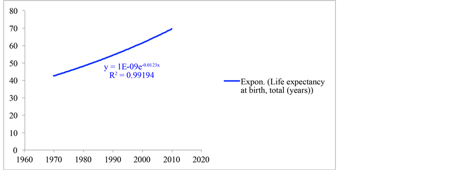 The time series trend line of life expectancy at birth computed from least squares trend line plotting method shows that the trend line explains approximately 99.2% of reality (R2 = 0.9919). The real annual rate of growth of life expectancy at birth is 1.2% (Figure 3). There is a solid pattern of growth of longevity throughout the period of past 40 years. The resultant annual average rate of growth of life expectancy at birth for the whole period is consistent.