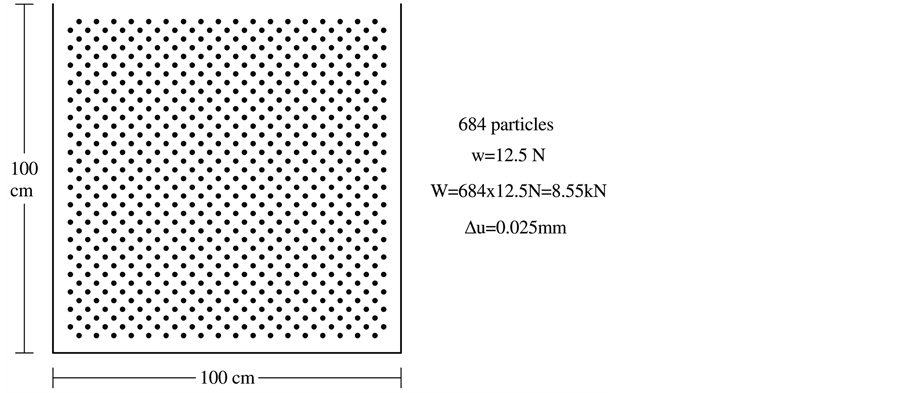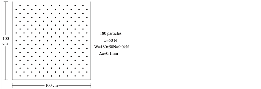 arranged, in such a way, so that to form elementary rhombs, which have an in-compressibility property, as described in previous Section 5. There are 10 rows of 9 particles, alternated with 9 rows of 10 particles, that is totally 2 × 9 × 10 = 180 particles. The weight of every particle is