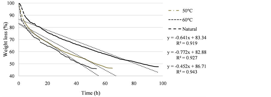 The slope of each drying curve for each temperature showed rapid weight loss. It was noted that oven drying at 60˚C presented a slope of 0.77, which was greater than the other trials.