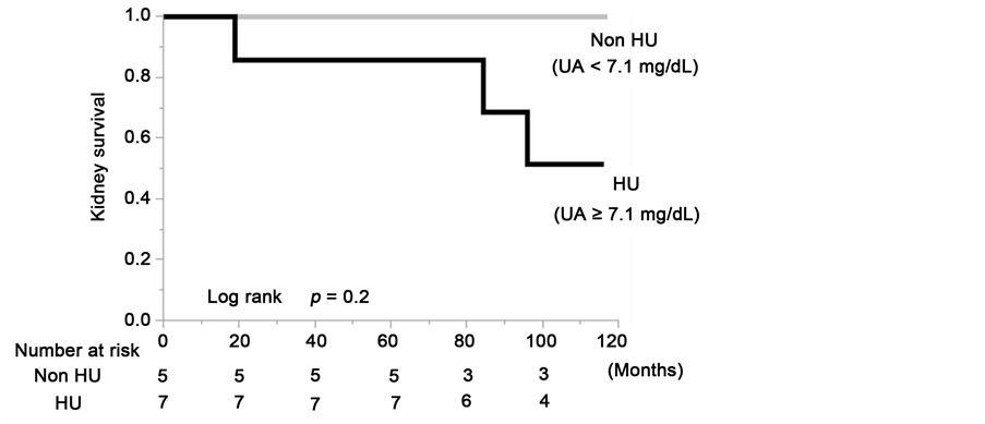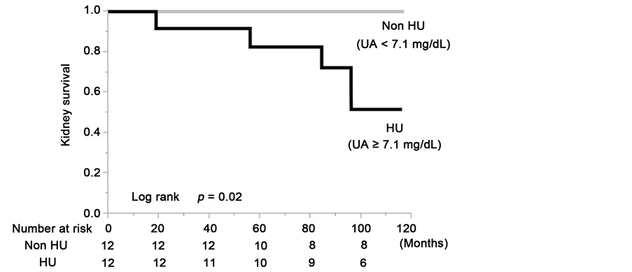 The predictive value of UA in regard to the progression of CKD is matter of controversy [5] - [11] . Although a causal role of HU in CKD has not been established [23] [24] , the results of several epidemiologic studies have indicated the existence of an association between HU and the development of CKD [25] [26] . HU has been found to independently predict the progression of kidney disease in nephrosclerosis [4] , diabetic nephropathy [27] [28] , IgA nephropathy [29] [30] [31] [32] , chronic allograft nephropathy [33] , and CKD [10] [26] , and HU has been reported to be associated with atherosclerosis [14] [34] and hypertension [35] . Thus, HU would seem to be associated with atherosclerosis and subsequent risk of hypertension and CKD, but the serum UA elevation in CKD patients makes it difficult to assess the pathophysiological role of UA in the progression of CKD. The present study focused on atherosclerosis/arteriosclerosis- related factors and examined the predictive value of HU in relation to CKD progression by using a propensity score-matching cohort.