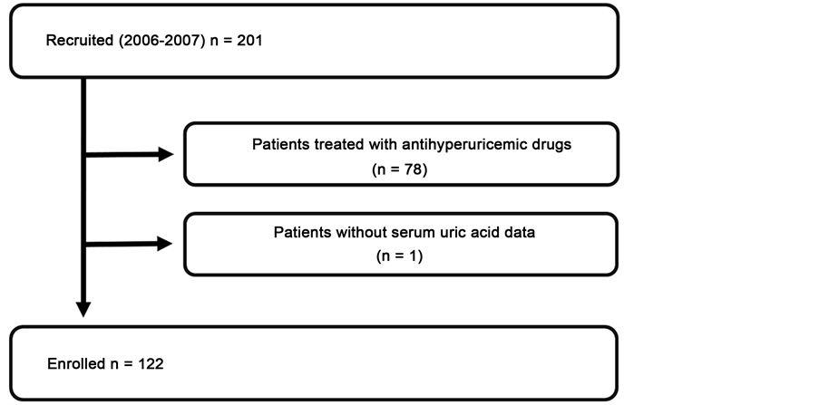 Abdominal computed tomography (CT) and carotid ultrasonography were performed on 201 CKD outpatients who attended the Kidney Center of Tokyo Women’s Medical University Hospital between August 2006 and August 2007. CKD was diagnosed according to previously described criteria [15] . Among these 201 patients, the following patients were excluded from participation: 1) patients who had been treated with antihyperuricemic agents; 2) patients with no UA data. The remaining 122 patients were ultimately enrolled as subjects of the present study (Figure 1).