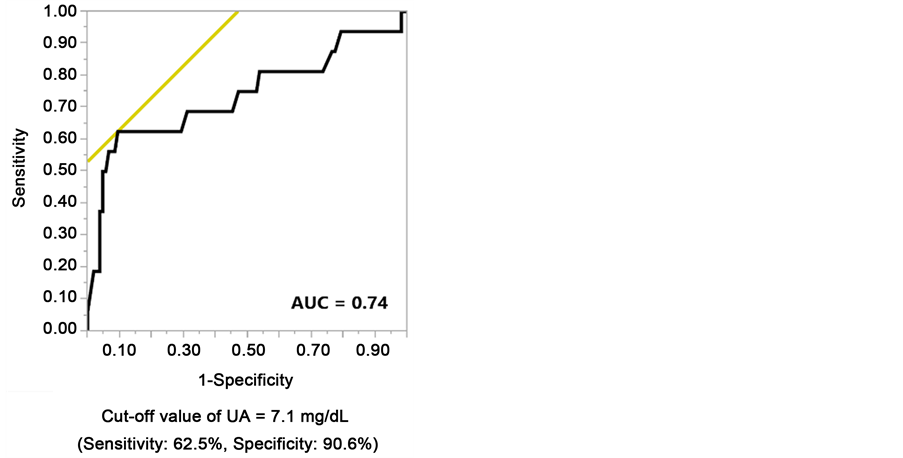 We performed ROC analyses to identify the optimal UA cut-off value for discriminating a ≥50% eGFR decline or ESRD during the follow-up examination, and the results showed that it was 7.1 mg/dL (AUC = 0.74, sensitivity = 62.5%, specificity = 90.6%, Figure 2).