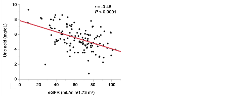 Chronic kidney disease (CKD) is affected by multiple risk factors for disease progression [1] [2] , and it is extremely important to identify risk factors for the acceleration of the CKD progression. The impact of the serum uric acid (UA) on renal prognosis of CKD patients has recently been attracting attention [3] , and our group has reported finding that the serum UA value can serve as a predictor of progression of kidney disease in biopsy-proven nephrosclerosis patients [4] . However, because the serum UA elevation due to the decreased renal UA clearance in CKD patients makes it difficult to assess the role of UA in the progression of CKD, the predictive value of UA in regard to the progression of CKD remains a matter of controversy [5] - [11] .