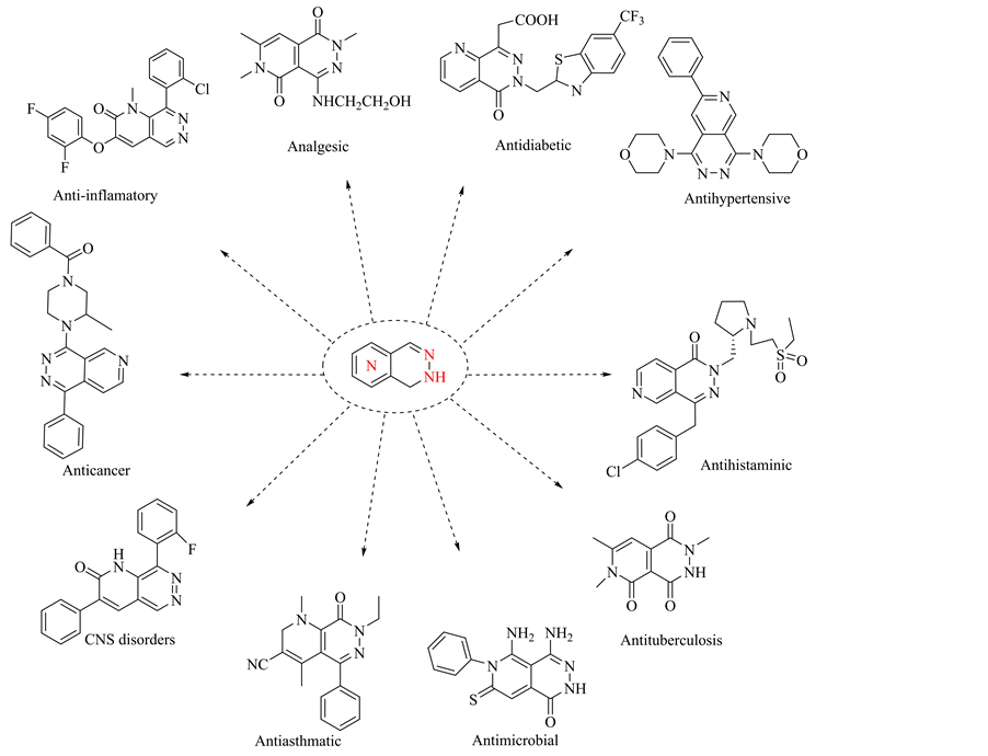 Recently, some new pharmaceutical development potentials have been realized with this class of compounds. Some pyrido[2,3-d]- and pyrido[3,4-d]pyridazines were found as protein kinase, especially p38 kinase, inhibitors for treating inflammation and related conditions including rheumatoid arthritis, psoriasis, and other inflammation disorders [7] [8] . A range of pyridopyridazinones have been assayed as potential analgesic agents and showed antinociceptive activity [9] . Some pyridopyridazie derivatives were studied for the treatment of tumors driven by inappropriate hedgehog signaling and demonstrated antagonism of human smoothened with IC50 less than 1 μM [10] . In addition, this nucleus showed antiasthmatic [11] , antidiabetic [12] , antituberculosis [13] , and antimicrobial activities [14] (Figure 2).
