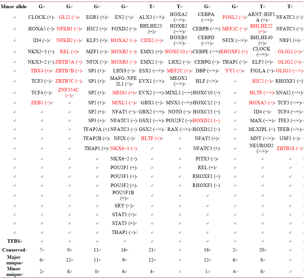 (rs2016520) has been associated with obesity risk and intracerebral hemorrhages while a second SNP (rs9794) has been found to be associated with hypertriglyceridemia and obesity in Han Chinese [9] [14] [17] . The two alleles (A/G) of the rs2016520 SNP does not generate any conserved punitive TFBS between the alleles while the common A allele generates twelve punitive unique TFBS and the minor G alleles generates eight punitive unique TFBS (Table 2). Of the common A allele TFBS, the NEUROD2 transcriptional regulator is implicated in neuronal determination and the OLIG3 TF which promotes formation and maturation of oligodendrocytes, especially within the brain could in part be associated with obesity risk and intracerebral hemorrhages (Supplement). The second SNPs (rs9794) has been associated with hypertriglyceridemia and obesity risk in Han Chinese [10] [11] [17] . The two alleles (C/G) of the rs9794 SNP generates eleven conserved punitive TFBS between the alleles while the common C allele generates eleven unique punitive TFBS and the minor G allele generates no unique TFBS (Table 2). Of the common C allele TFBS, the GCM1 and 2 TFs bind to the trophoblast specific element 2 (TSE2) of the aromatase gene enhancer and act as a master regulator of parathyroid development, respectively (Supplement). The deletion of these TFBS caused by the minor G allele for these two TFs could in part be associated with hypertriglyceridemia and obesity risk in Han Chinese [10] [17] .
