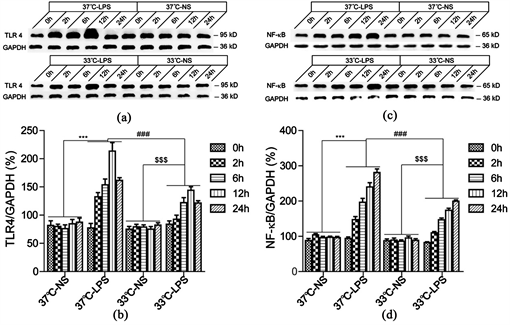 Figure 2. Expressions of TLR 4 receptor and NF-κB protein in each group at different time points by western blot. (a) Western blot results of TLR4 receptor protein in the 37˚C-NS group (upper) and the 33˚C-NS group (lower); (b) Relative grey value of TLR4 receptor protein on GAPDH protein (%); (c) Western blot results of NF-κB protein in the 37˚C-NS group (upper) and the 33˚C-NS group (lower); (d) Relative grey value of NF-kB protein on GAPDH protein (%). ***: the 37˚C-LPS group vs. the 37˚C-NS group, P < 0.001; $$$: the 33˚C-LPS group vs. the 33˚C-NS group, P < 0.001; ###: the 37˚C-LPS Group vs. the 33˚C-LPS group, P < 0.001; Note: TLR4: toll-like receptor 4; NF-κB: nuclear factor B; GAPDH: glyceraldehyde 3-phosphate catalase; LPS: lipopolysaccharide; NS: normal saline; normal temperature: room temperature: 37˚C; mild hypothermia: 33˚C.