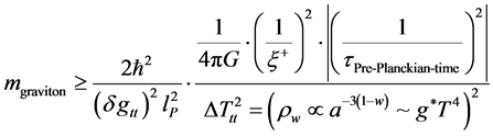 i.e. if we have a comparatively low initial temperature, T, it will mean a large initial graviton mass. If the T is of the order of Planck temperature, say 1032 Kelvin, then the above will have a lower graviton mass value of about 10−66 grams. It goes up if there is what is called a (colder cosmology) about 1 order of magnitude lower initial temperature, leading to the mass of a graviton bounded below by 10−58 grams. Really cold initial temperatures far lower than 1032 degrees Kelvin for T would lead to maybe even 10−50 grams for the initial lower bound to the graviton mass.