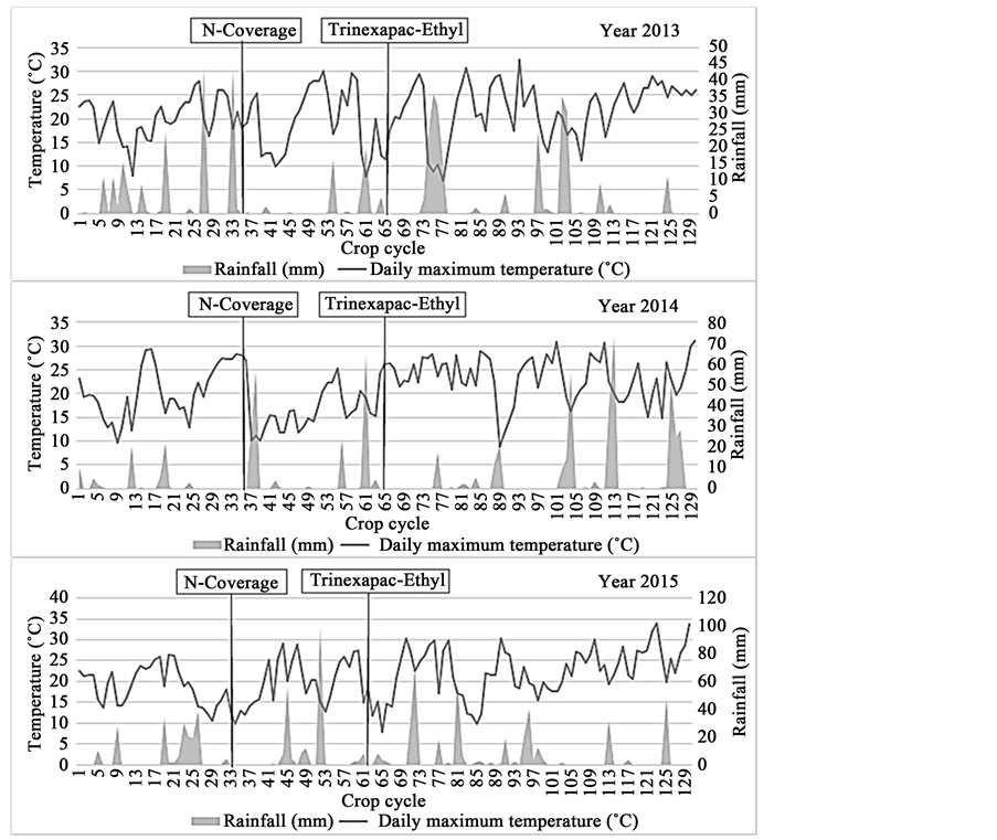 In Figure 1, it is observed that at the time of nitrogen application in 2014, the maximum temperature averages were higher (±27˚C) in relation to 2015 and