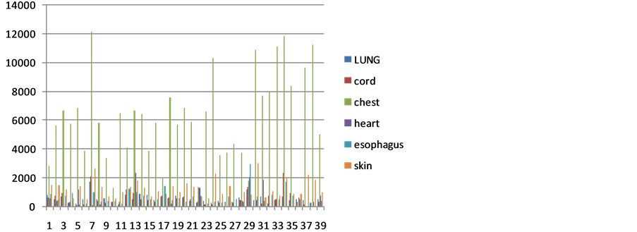 Figure 4. EUDs for organs at risk in lung SBRT. (The y-axis is in cGy and the x-axis is the patient number).
