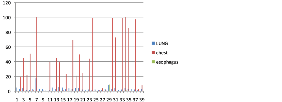 For patients who undergo lung SBRT, the most obvious toxicities are pneumonitis, esophagitis, and chest- wall pain; pulmonary and cardiovascular complications are also very common. Accordingly, within our sample the NTCP values for the cords, heart, and skin are 0.00%. The highest observed NTCP value is for the chest, while smaller but still significant NTCP values are observed for the total lung, treated lung, and esophagus. The large value of NTCP for the chest can be attributed to several factors, including tumor location and some issues that are patient-dependent. For example, it is believed that female gender and a small tumor-chest wall separation are both risk factors for rib fracture [34] .
