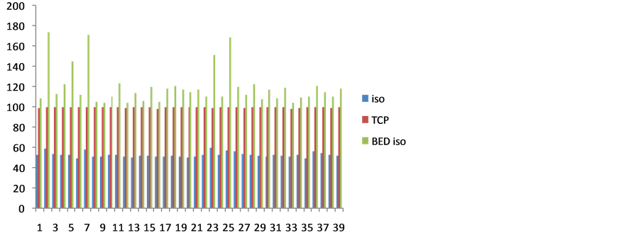Figure 6. TCP, BED at the isocenter, and isocenter dose for lung SBRT The y-axis is in Gy and the x-axis represents the patient number).