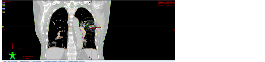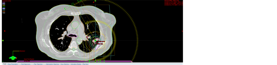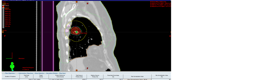 Non-small cell lung cancer (NSCLC) continues to be the leading cause of cancer-related mortality [1] . Dose escalation has been proposed to improve local control [2] -[5] and capitalize on the therapeutic ratio of thoracic radiotherapy, which is mainly limited by the potential toxicity to organs at risk (OARs). In brief, NSCLC is the most commonly diagnosed type of lung cancer that accounts for 85% of all cases characterized by slow growth and spread compared to other small cell lung cancer [6] . NSCLC encompasses a number of different types of lung cancer, which are categorized as “squamous” or “non-squamous”. Smoking, ionizing radiation, occupational risks, environment, indoor air pollution and diseases as risk factors for lung cancer are the ultimate causes and risk factors. NSCLC is associated with persistent cough, shortness of breath, coughing up phlegm (sputum) with signs of blood, aches or pains when breathing or coughing, loss of appetite, fatigue, and loss of weight. NSCLC is detected using several options that include cytology, bronchoscopy, and needle biopsy. The Prognosis based on three year survival rates for lung cancer patient who received stereotactic body radiation therapy reveals a survival rate of 55.8% [7] .
