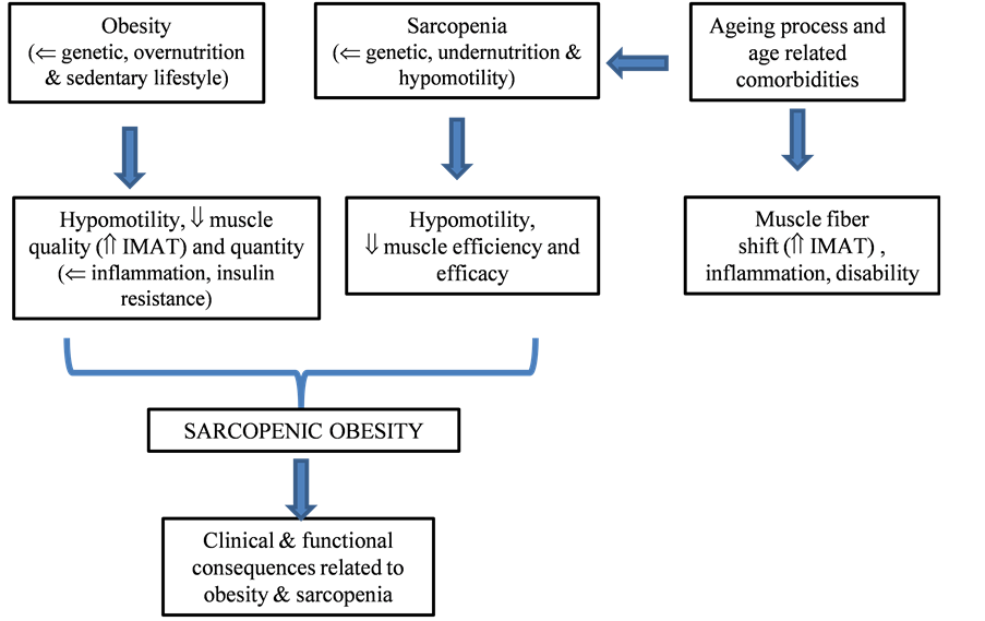 A wealth of studies have focused on the reduction of lean body mass (LBM) in the elderly, that is simultaneously accompanied by the increase of the fat mass percentage, even when body weight and body mass index (BMI) remain stable [5] - [10] . The above mentioned changes in body composition associated with the ageing process have been demonstrated to occur also in obesity [5] -[10] (Figure 1). An imbalance between lean mass, excess body fat and total body size may appear earlier in obese adults [5] [6] , because of the disproportion between the even conserved lean mass when compared to fat mass, exceeding body weight that lean mass could support.