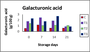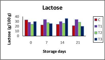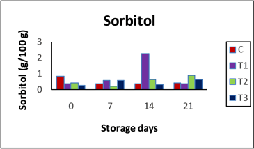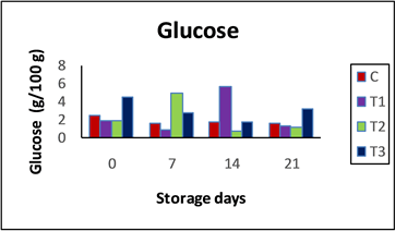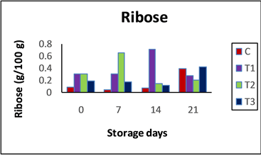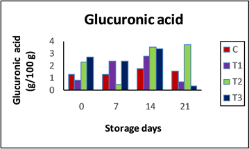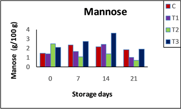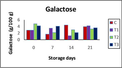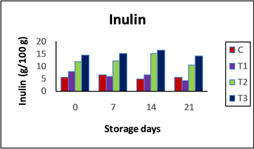 Some lactic acid bacteria such as Streptococcus thermophilus transport lactose by a lac permease transport system, followed by an intracellular hydrolysis and phosphorylation [38] . The growth of Lactobacillus and Bifidobacterium were observed in media with the addition of prebiotics. Other authors reported that galacto-oligosaccharides and fructo-oligosaccharides with lower DP are best in supporting the growth of bifidobacteria and carbohydrates with high DP are poor substrates for bifidobacteria [39] . Table 3 & Figure 2 showed the inulin, sugars and organic acids content in water extracts in yoghurt, g/100 g dry weight after 0, 7, 14 and 21 days from production. The obtained Jerusalem artichoke could be used as an additive in different concentrations (2.5% & 5%) in kinds of functional foods like yoghurt that the biochemical composition showed there were the development in the concentrations of all sugars which were determined. The obtained results showed there were increase in a lot of determined sugars especially in group C & D like inulin; Fructose; glucose; galactose; ribose and mannose & organic acids compared with control and group B during the storage time.