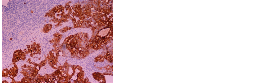 A biopsy of the axillary lymph node was undertaken, and its histologic evaluation showed structures of adenocarcinoma involving lymphoid parenchyma, with expression of the marker CK 20, compatible with a colon cancer metastasis (Figure 3(a) and Figure 3(b)).