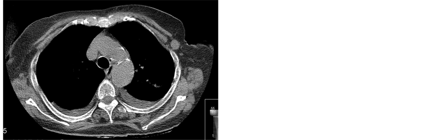 Staging of the tumor was completed with a thorax CT scan that identified an enlarged lymph node in the left axilla with 15 mm in diameter. There were no lung metastasis nor mediastinicenlarged lymph nodes (Figure 2(a) and Figure 2(b)).