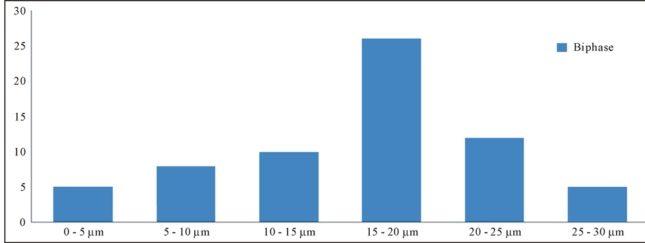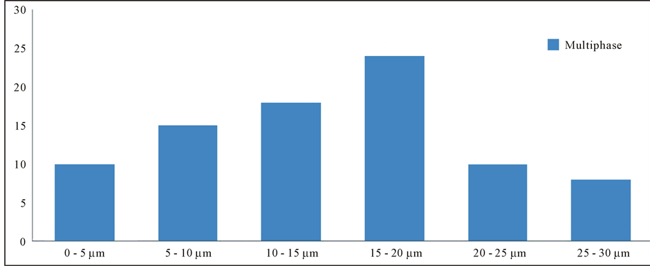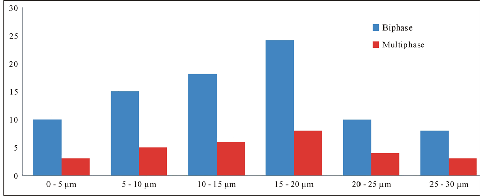 Biphase fluid inclusions have two phases at room temperature. The Primary biphase fluid inclusions appear to have a vapor phase (represented by a bubble inside the inclusion) and a liquid phase under the microscope ( Plate 2 ) and vice versa. The bubble phase generally observed to have a dark periphery. The biphase fluid inclusions are very wide in shapes and sizes (Table 1). The population of biphase and multiphase fluid inclusions ( Plate 3 ) is shown by the histogram (Figure 4).
