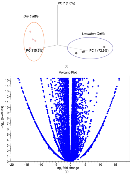Figure 1. (a) The PCA plot shows that gene expression profiles of rumen epithelia from dry and lactation cattle fall into two very distinct clusters. (b) Volcano plots: the differentially expressed genes during dry and lactation periods.