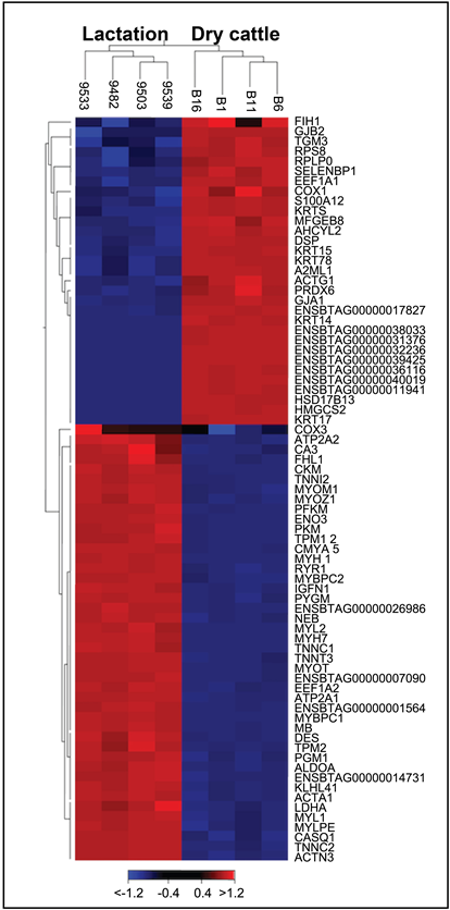 The CLC Genomics Workbench (v10, Qiagen) was used for RNA-sequencing data analysis. Raw sequence reads were first checked using a quality control pipeline. Nucleotides of each raw read were scanned for low quality and trimmed. Trimmed reads were aligned to the bovine reference genome (BosTau_UMD3.1). Gene expression levels were normalized as reads per kilobase of exon model per million mapped reads (RPKM) using the CLC transcriptomic analysis tool. The top 200 highly expressed genes selected by the sum of RPKM values in all libraries were used for heat map analysis with hierarchical clustering module in the CLC Genomics Workbench (Setting: sample and feature clustering, normalized expression value, Euclidean distance and complete linkage).