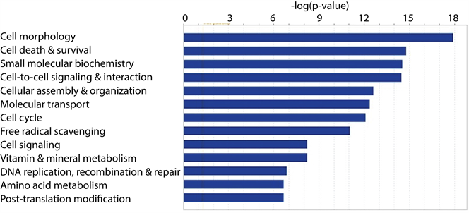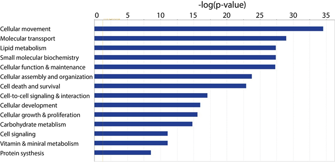 Figure 3. Global functional analyses. (a) Molecular and cellular function analysis of the differentially expressed genes; (b) Physiological functions of the differentially expressed genes. The significance value associated with a function in global analysis is a measure for how likely it is that genes from the dataset file under investigation participate in that function. The significance is expressed as a p value that is calculated using the right-tailed Fisher’s exact test.