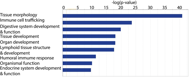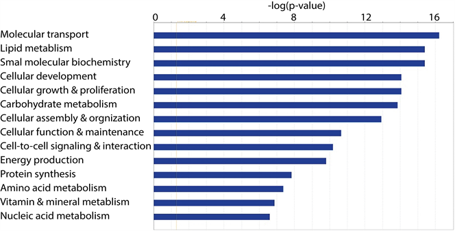 We looked further into the biological function and differentially expressed genes in lactating cattle by performing function and pathway analysis using IPA. Analysis of differentially expressed genes in lactating cattle revealed the most significantly perturbed biological functions in the dataset. The differentially expressed genes were first analyzed as a whole dataset. The top 14 molecular and cellular functions, as determined by p-value, are shown in Figure 3(a). These functions, such as cell morphology, cellular function, and maintenance, characterized the mechanisms related to the adaptation of rumen epithelia to the physiological changes during lactation, which were represented in the physiological function changes revealed by IPA analysis (Figure 3(b)). We also specifically analyzed the up-regulated genes and down-regulated genes separately in the dataset (Figure 4(a) and Figure 4(b)). Those functions could exemplify the most significantly enhanced or inhibited biological functions in the rumen epithelia of lactating cattle.