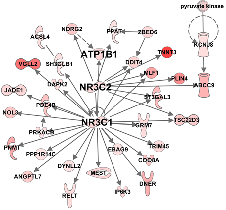 The dataset containing gene identifiers and corresponding expression values was uploaded into the Ingenuity Pathways Analysis application. Each gene identifier was mapped to its corresponding gene object in the Ingenuity Pathways Knowledge Base. These genes, called focus genes, were overlaid onto a global molecular network developed from information contained in the Ingenuity Pathways Knowledge Base. Networks of these focus genes were then algorithmically generated based on their connectivity.