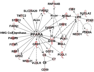 Another functionally relevant gene network is the network centered on the PPARA gene (Figure 6). The major functions of this network are lipid metabolism, molecule transport, and small molecule biochemistry. The PPARA gene was identified as an upstream regulator of gene expression (Table 6) and was in the center of this network.