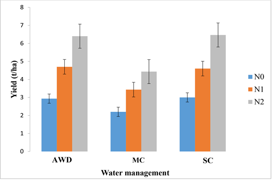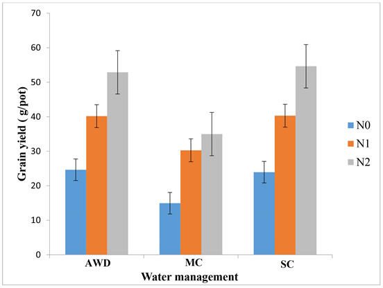 Figure 2. Grain yield of rice as influenced by N fertilizer and water management. AWD: alternate wetting and drying soil condition; MC: moist soil condition between field capacity and permanent wilting point; CS: continuously submerged soil condition; N0, N1 and N2, are 0, 60 and 90 kg∙N∙ha−1 respectively. Bars represent means ± SEM of 3 replicates.