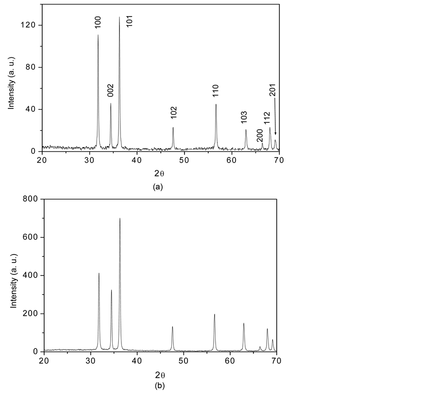 Figure 1. The X-ray diffraction pattern of the (a) ZnO solid spheres deposited on silicon substrates; (b) of the ZnO particles obtained without the SDA HMTA.