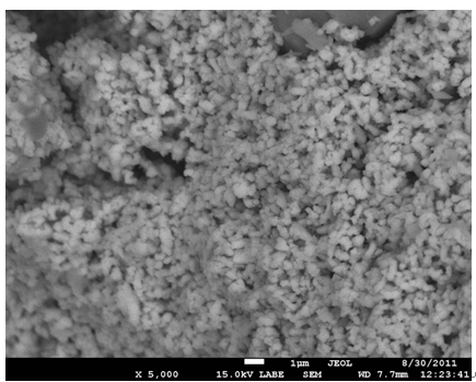 Figure 2 shows the SEM image of the ZnO solid spheres grown on silicon substrates they have an approximate diameter of 0.5 μm. The ZnO spheres growth of monodisperse form. It is clearly seen that the size of the solid spheres is uniform e. d. they have similar size. To check the effect of the SDA hexamethylenetetramine on the growth of the solid spheres another hydrothermal reaction without SDA was realized under the same condition that with SDA; Figure 3 is a SEM image of the obtained product: only ZnO particles but no spheres were obtained.