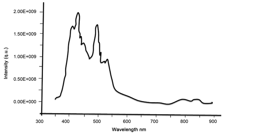 Figure 4 shows the room temperature photoluminescence (PL) measurement of the ZnO solid spheres nanostructures, the emission spectrum was obtained using the laser line with a wavelength of 358 nm from an He:Cd laser as the excitation source, the emission spectrum presents the two typical emission bands centered the first about 380 nm and the second with a maximum centered between 500 and 530 nm; the first band is a exciton emission band in the UV region and is caused by the radiative annihilation of excitons, the second is an intense band in the green region of the visible spectrum produced by the radiative recombination of an electron from a level in the conduction band and an deeply trapped hole in the bulk (Vo) of an ZnO particle [30] [31] . However, Figure 4 shows that the intensity of the band visible is less than the intensity of exciton band, this is caused by an effect of particle size as proposed by Van Dijken, which establish that as the size of the ZnO particles increases the intensity of visible emission decreases and the intensity of exciton emission increase [32] . In this case, from Figure 2 the ZnO nanospheres size is about 0.5 µ in diameter is bigger than Dijken particles resulting thus in a decreasing of the intensity of green visible respect to that of exciton emission.