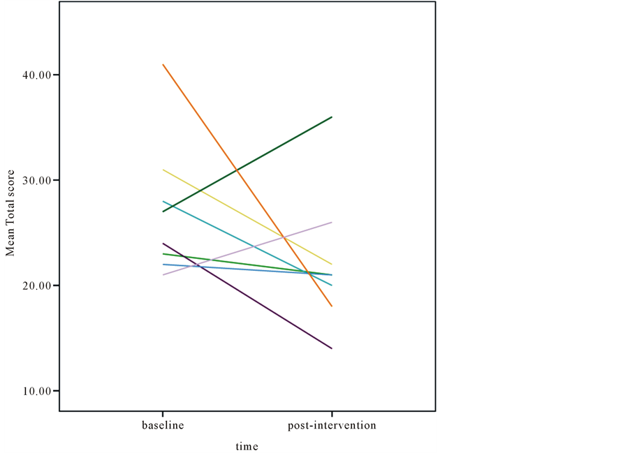 The sum of the scores is used as the outcome variable as advised by Goldberg with lower total scores demonstrating better psychological well-being. As indicated in Figure 1, total scores are decreasing for most participants indicating that the psychological well-being of the academic staff improved over the life of the project.