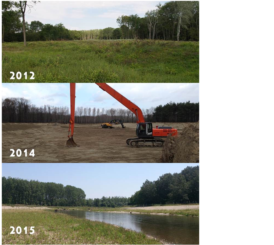 The section of the river Traisen between Traismauer and Zwentendorf is to be replenished with a vital alluvial landscape. After years of considering improvements to the ecological situation of the river Traisen, scientists and technicians began with the idea of creating a new river bed in 2005. This new river bed does not follow the historical course of the river, a fact that makes the LIFE+ Traisen project unique. The intention was to link the new river with the wetlands, restore fish accessibility and offer diverse habitats. The design of the LIFE+ Traisen project follows specifications of the European Water Framework Directive [25] and contributes significantly to the improvement of the Natura 2000 area by improving the hydro-ecological conditions and creating natural riparian habitats with characteristic vegetation structures. Its main goals are the reshaping of the lower course of the Traisen into an ecologically valuable and functioning river landscape according to the EU Water Framework Directive on the one hand, and the development of habitats according to the Habitats Directive on the other. Top priority is assigned to the development of around 80 ha of “softwood riparian forest” (Habitat type 91E0*) through natural flooding by the new meandering course of the river Traisen (Figure 1).