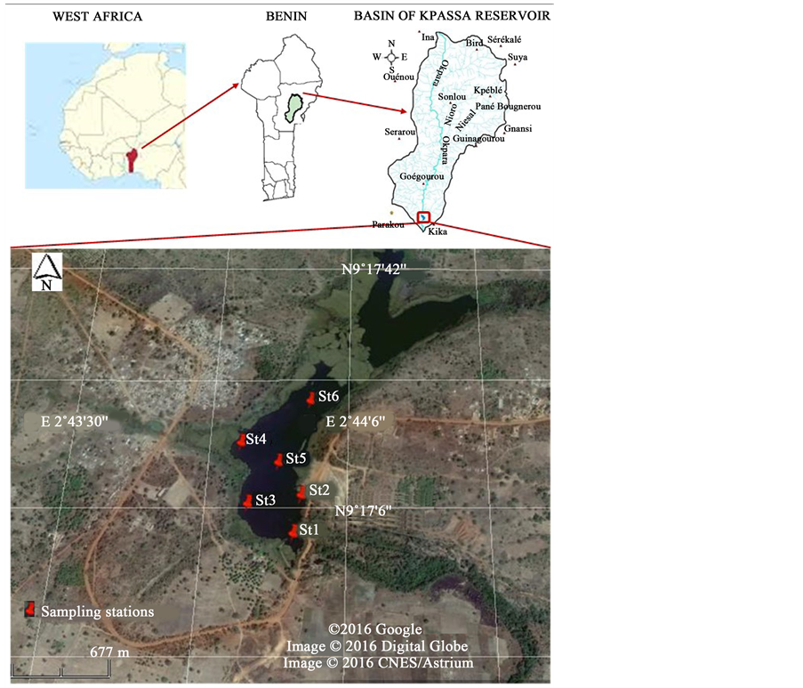 Located at 13.5 km at east of Parakou city (N 09˚17'034; E 002˚43'975) in Borgou department, Kpassa reservoir on Okpara with an area of 190 ha [16] (Figure 1) has mainly the role to supply the 254,254 inhabitants [17] of Parakou in drinking water. Parakou city is located at N 09˚21' and E 02˚36' in north-east of Benin, at 450 km from the economic capital Cotonou and at an average altitude of 350 m [12] . Okpara is one of the tributaries of river Ouémé of Benin [18] .