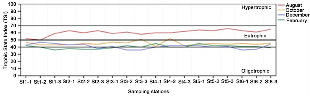 Figure 2. Spatial variation of Carlson’s Trophic State Index (TSI) at different month in Kpassa reservoir with limiting degrees of trophic status.