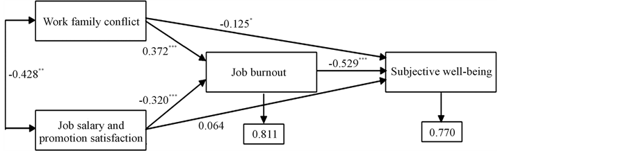 would directly influence subjective well-being, with the direct effect coefficient of −0.529 (P < 0.001). 4) Job salary and promotion satisfaction would indirectly impact subjective well-being through job burnout, which played a completely mediating role on the relation between job salary and promotion satisfaction and subjective well-being. Job salary and promotion satisfaction indirectly affected subjective well-being, with the indirect effect coefficient of 0.169 (−0.529 × −0.320). In conclusion, the hypothesis 1, 2, 3 and 5 were verified and the hypothesis 4 was proved to be false. Consequently, job salary and promotion satisfaction does not directly affect subjective well-being and job burnout is mediating variable through which work-family conflict and job salary and promotion satisfaction influence subjective well-being.