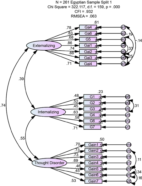 Exploratory factor analysis of both the Egyptian sub-sample and the Polish sample yielded three factors with all items loaded significantly on the first factor (before rotation) which may validate the one-factor solution of psychopathology obtained in previous studies. The Oblimin rotation produced three clear-cut factors that represented the three constructs (thought disorder, internalizing and externalizing (Table 2, see also Appendix 1). The three factors accounted for 48.29% of the variance. The first factor loaded on thought disorder items and accounted for 33.67% of the variance. The second factor loaded on internalizing items and accounted for 10.06% of the variance. The third factor loaded on externalizing items and suicidality and accounted for 4.56% of the variance. We deleted the items that have less than .40 loadings as well as those that have cross-loading (10 items), and reanalyzed the remaining 20 items. The results indicated a clean three factors solution with a different order (Table 3, see also