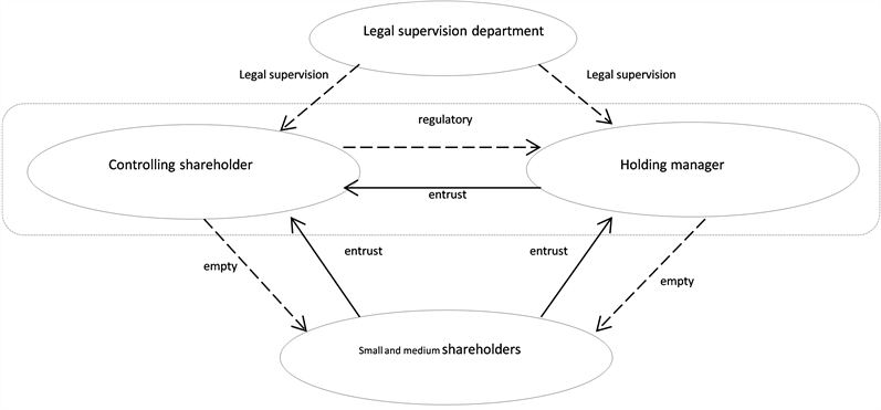 If we want to solve the problem that state-owned controlling shareholders occupy the interests of medium and small shareholders, so as to improve the enthusiasm of private capital into state-owned enterprises, it must remove the obstacles that affect the enthusiasm of private capital. Both state-owned capital holding and state-owned capital equity participation should weaken the government’s intervention in enterprise operation and management, give full play to professional managers’ ability of operation and management, and enable mixed ownership enterprises to develop healthily according to the requirements of marketization [2] . Therefore, we have constructed a governance framework, as shown in Figure 1(b) relationship structure. Only by cutting off the interest chain between managers and state-controlled shareholders and giving professional managers the mechanism of equity incentive can the interests of operators and medium and small shareholders be truly achieved.
