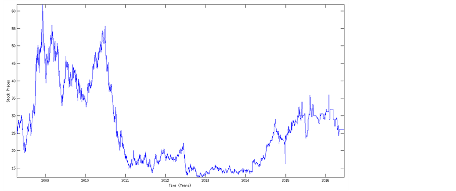 Stock prices indicate the strength and performance of the company. Any data can be used but with reference to this analysis we use data from AngloGold Ashanti Ghana (AGA). A daily high frequency stock prices data from AGA containing the closing prices from 16 April 2008 to 17 June 2016 was plotted with time (in years) as shown in Figure 1.