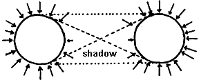 Figure 3.(a) I-meteons impinging randomly from all sides on an isolated coarse spherical body generate no net “push” on it. https://upload.wikimedia.org/wikipedia/commons/thumb/2/2d/Pushing1.svg/225px-Pushing1.svg.png (b) Coarse bodies “shadowing” each other. https://encrypted-tbn1.gstatic.com/images?q=tbn:ANd9GcRK4tfCKk7igUhiCcKXgXQJaZv7L6Y76rq6kWJwvInTWBGpgf2C